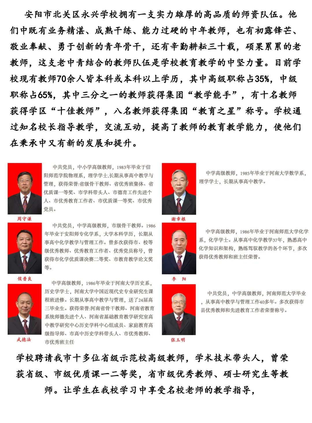 藏龙卧虎地,群贤雅聚处。学校成立之初,就把教师的招聘和培养作为工作的重中之重。面向全国高薪招聘的教师中,既有国内外教育背景及丰富教育教学经验的中青年教师,也有在市重点中学任教多年的名优骨干教师。学校成立以来,学校以“华山国际教育集团”为依托,做到待遇招人,真情待人,平台留人,事业成人。2023年,又有一大批高素质、高水平、高能力的教师齐聚永兴,即将开启在永兴学校的育人之旅。